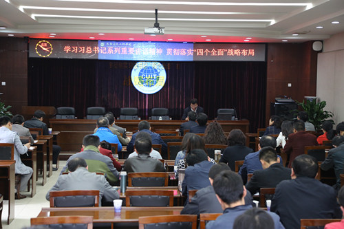 【本网讯】4月23日下午,学院在行政楼一会议室召开党委中心(扩大)组学习会,专题学习贯彻习近平总书记“四个全面”战略布局。学院领导、处级以上干部参加会议,会议由学院院长周激流主持。