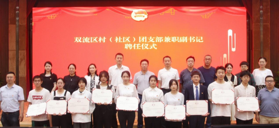 【本网讯】5月26日下午,双流区村(社区)团支部副书记聘任仪式在我校航空港校区国际会议厅举行。学校党委副书记马洪江,双流区东升街道党工委书记刘伟、黄甲街道党工委书记尹宏波,学校党委组织部、宣传部、学生工作部、校团委以及双流区东升街道、黄甲街道团工委相关负责人参加了聘任仪式。聘任仪式由校团委书记丁恒康主持。