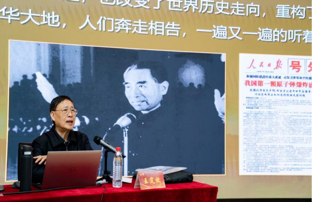 讲座后,党委学生工作部部长龚晓林与同学们分享了感想。他谈到,在新中国成立初期,我国军事力量相对薄弱,在国际舞台上的影响力也受到了一定的局限,1964年原子弹爆炸成功标志着中国以崭新姿态登上世界舞台。“两弹一星”为中国赢得了和平环境,提升了国际地位,促进了科学技术发展,增强了民族自信心,为后续发展奠定了坚实基础。他希望同学们能铭记这段历史,为国家的发展贡献青春力量。